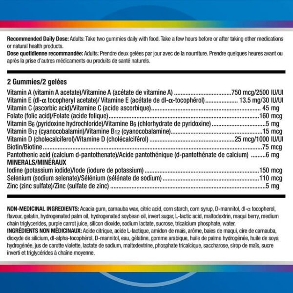 Centrum MultiGummies Men is a delicious way to help support the immune system, maintain eyesight, maintain the body’s ability to metabolize nutrients, and provide antioxidants with just two gummies a day.