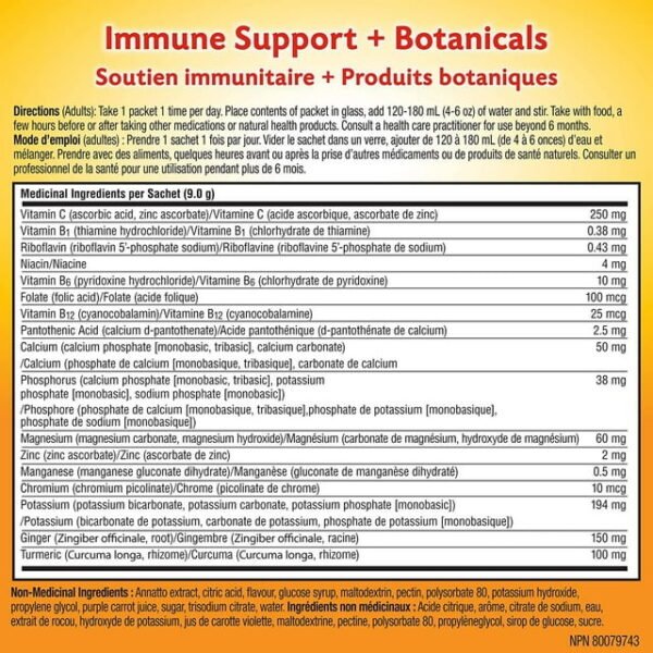 Citrus-Ginger Flavoured Fizzy Drink Mix Non-Medicinal Ingredients: Aspartic acid, citric acid, flavour, fructose, glycine, malic acid, tapioca, modified corn starch, rebaudioside A, silicon dioxide, sodium bicarbonate, sodium citrate, sugar, tartaric acid. Medicinal Ingredients per Sachet (9.0 g) Vitamin C (ascorbic acid, zinc ascorbate) – 250 mg Vitamin B1 (thiamine hydrochloride) – 0.38 mg Riboflavin (riboflavin 5’-phosphate sodium) – 0.43 mg Niacin – 4 mg Vitamin B6 (pyridoxine hydrochloride) – 10 mg Folate (folic acid) – 100 mcg Vitamin B12 (cyanocobalamin) – 25 mcg Pantothenic Acid (calcium d-pantothenate) – 2.5 mg Calcium (calcium phosphate [monobasic, tribasic], calcium carbonate) – 50 mg Phosphorus (calcium phosphate [monobasic, tribasic], potassium phosphate [monobasic], sodium phosphate [monobasic]) – 38 mg Magnesium (magnesium carbonate, magnesium hydroxide) – 60 mg Zinc (zinc ascorbate) – 2 mg Manganese (manganese gluconate dihydrate) – 0.5 mg Chromium (chromium picolinate) – 10 mcg Potassium (potassium bicarbonate, potassium carbonate, potassium phosphate [monobasic]) – 194 mg Ginger (Zingiber officinale, root) – 150 mg Turmeric (Curcuma longa, rhizome) – 100 mg