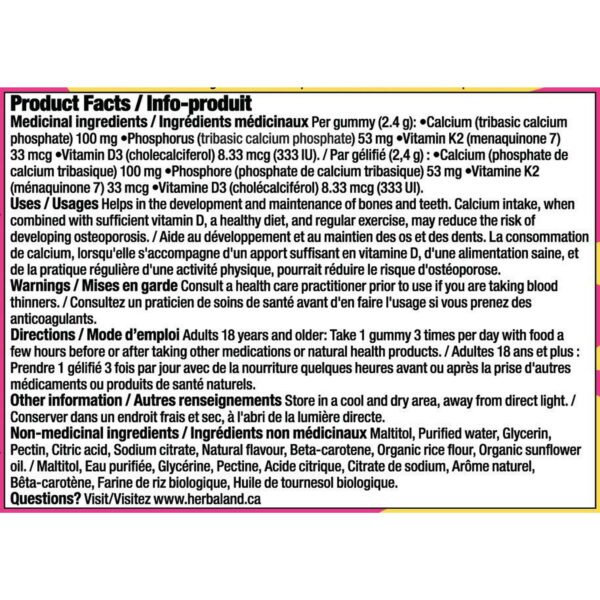Medicinal ingredients Per gummy (2.4 g): •Calcium (tribasic calcium phosphate) 100 mg •Phosphorus (tribasic calcium phosphate) 53 mg •Vitamin K2 (menaquinone 7) 33.33 mcg •Vitamin D (vitamin D3, cholecalciferol) 8.33 mcg (333 IU). Non-medicinal ingredients Maltitol, Purified water, Glycerin, Pectin, Citric acid, Sodium citrate, Natural flavour, Beta-carotene, Organic rice flour, Organic sunflower oil.