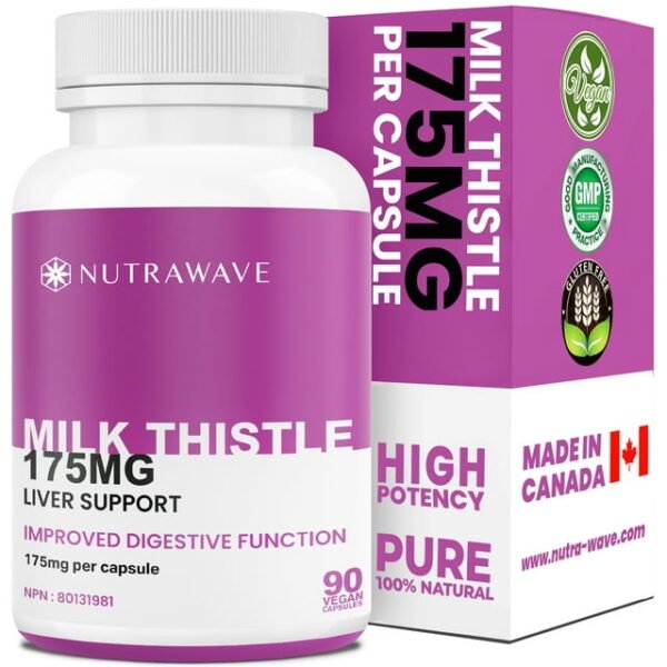 Nutrawave Milk Thistle 175 Mg Capsules provide 80% standardized milk thistle extract (silymarin) to help support liver health, natural detoxification, and healthy digestion. Each vegan capsule is made from premium-quality milk thistle seed to ensure purity and potency.