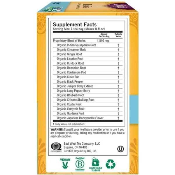 Indian Sarsaparilla Root, Cinnamon Bark, Ginger Root, Licorice Root, Burdock Root, Dandelion Root, Cardamom, Clove Bud, Black Pepper, Juniper Berry Extract, Long Pepper Berry, Rhubarb Root, Chinese Skullcap Root, Coptis Root, Forsythia Fruit, Gardenia Fruit.